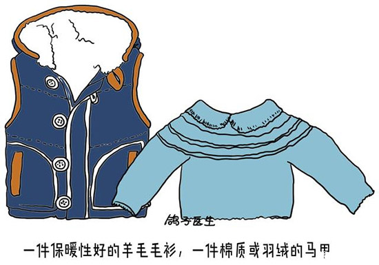◆如夜间的温度为10℃,则穿衣温度=26-10=16=6+4+4+2,可以给孩子穿一件薄款羽绒服(6℃)+厚羊毛衫(4℃)+棉背心(4℃)+厚棉毛衫(2℃)。可根据家里的衣物随时搭配,只要让孩子的穿衣温度是26℃与室温之差即可。