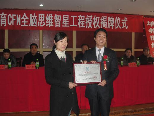 群峰教育机构总裁李群峰为商丘永城市新世纪幼儿园园长姬莉颁发授权书