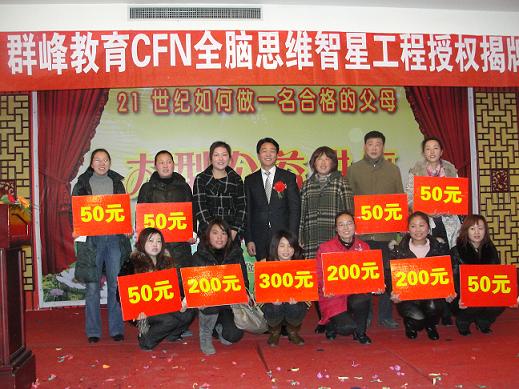 群峰教育总裁李群峰和参加现场报名获得奖项的家长们合影