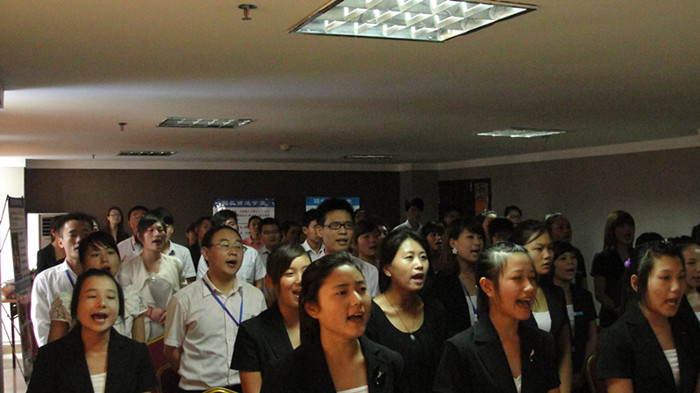 最后,李老师带领大家合唱一首《众人划桨开大船》,结束了这场会议。