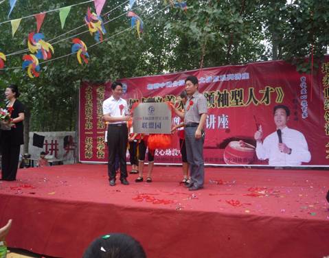 群峰教育集团董事长李群峰和杞县沙沃乡中心校张主任一同为爱心幼教中心揭牌。从今天开始,沙沃乡爱心幼教中心成为群峰教育集团爱心联盟园。
