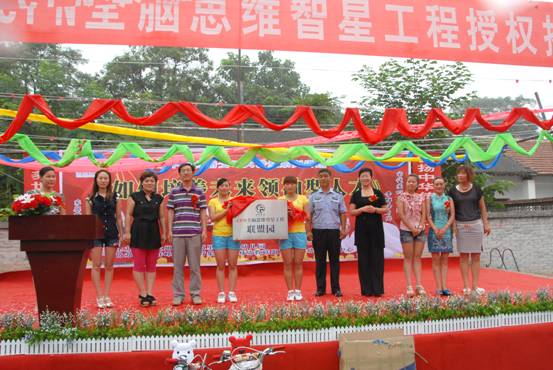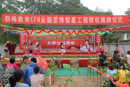 图为郭老师为幼儿园颁发“群峰教育CFN全脑思维智星工程联盟园”称号。一同走上舞台的还有教育局的领导等。