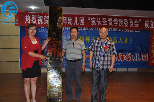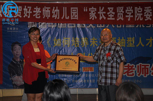 民权县关工委负责人董老代表群峰教育集团为好老师幼儿园授《群峰忠国圣贤家长学院》牌。