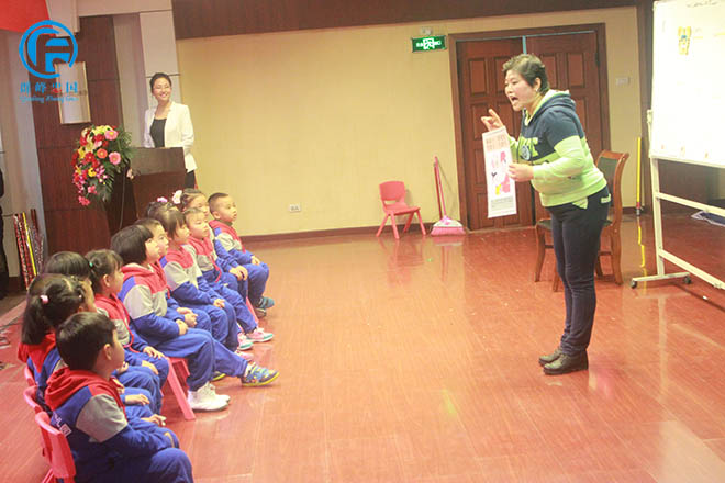 1号潢川红太阳幼儿园王梅老师正在引导孩子们积极发言。
