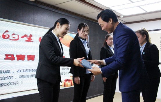 (12月生日的三位群峰家人现场接受李老师馈赠与祝福,郝灵真老师跟随李群峰老
