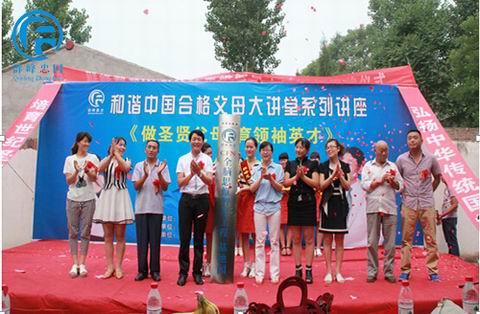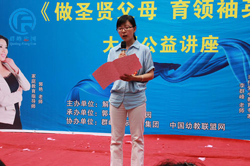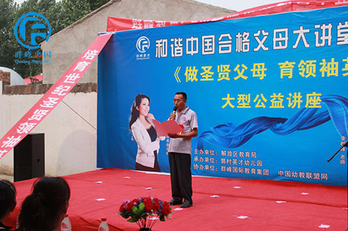 2014年6月24号上午,焦作郭村英才幼儿园隆重举行《做圣贤父母,育领袖英才》大型公益讲座,在当代爱心教育专家、群峰忠国教育集团董事长李群峰老师的精彩分享下成功召开。会议现场人头涌动,郭村英才幼儿园司园长引进了国学教育新理念,得到了家长一致认可及当地相关领导的大力支持。为了让孩子得到好的教育,为了让孩子能够早日成才,家长们争先报名并领取了国学教材。