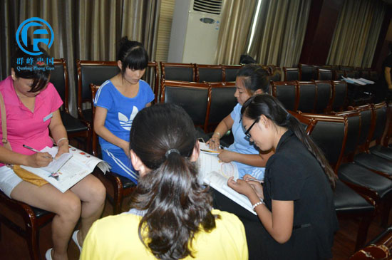群峰忠国教育集团司亚蕊老师引导老师们,怎么来上好《弟子规》课程,老师们仔细的看每个板块的内容,而且教学过程中的每个动作老师们也都在认真的练习。