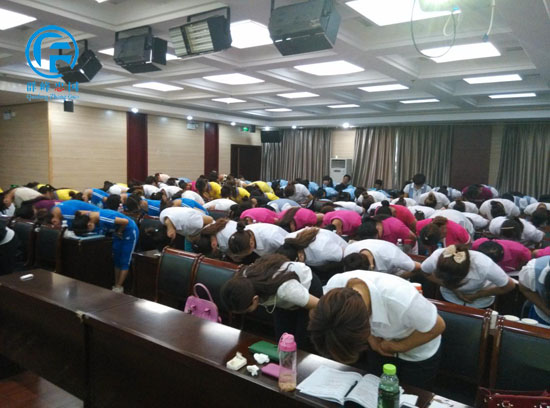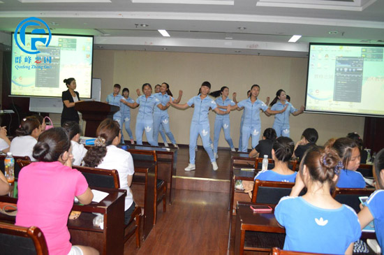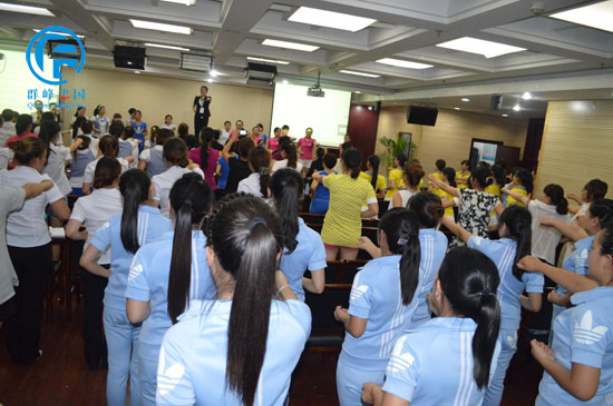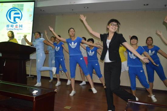 群峰忠国教育集团课题中心的段小品老师在教老师们练习弟子规训练操,老师们都非常积极主动的学习。
