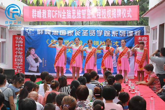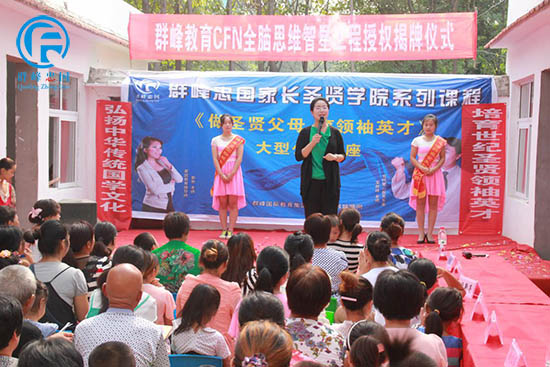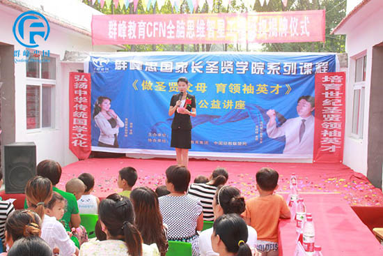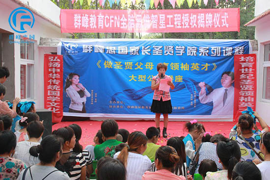 群峰忠国教育集团执行董事、忠国幼教联盟协会副秘书长、和谐家庭教育讲师郭艳女士及柏梁镇中心校领导及各村书记进行了隆重的授权揭牌仪式郭艳老师正在向各位家长分享如何《做圣贤父母·与领袖英才》;